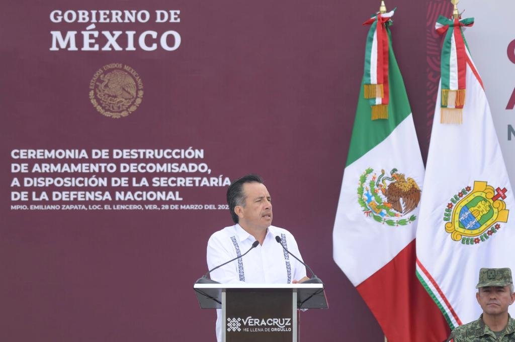 XALAPA, VER.- El gobernador Cuitláhuac García Jiménez, informó que un arma asegurada y destruida representa vidas salvadas al tiempo de resaltar que desde la llegada de esta administración estatal los delitos van a la baja.