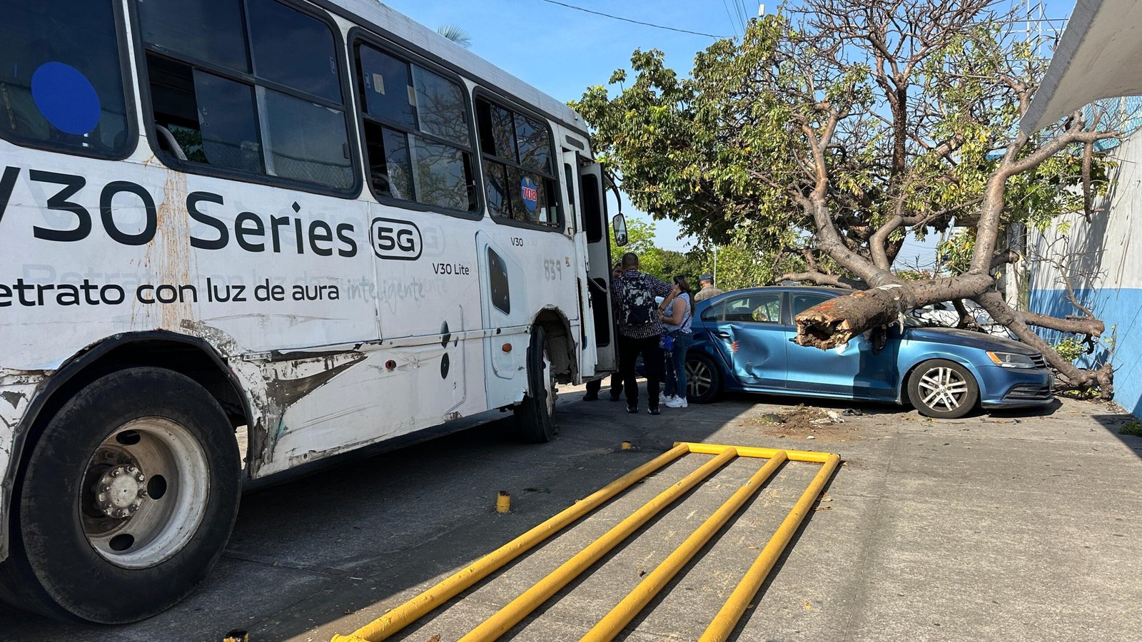 Veracruz, Ver.- Un autobús de pasaje de la ruta Comercial Mexicana chocó contra el barandal de la escuela Constanza Condes de la Torre, debido al impacto tiró un árbol que destrozó a un automóvil estacionado, dejando severos daños materiales.