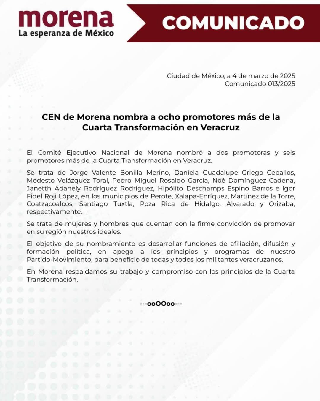 El texto oficial aseveró que el objetivo de su nombramiento es desarrollar funciones de afiliación, difusión y formación política, en apego a los principios y programas del Movimiento.