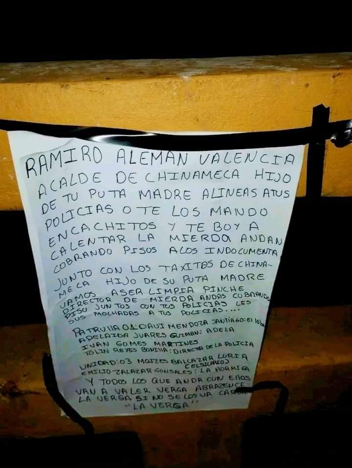 Está noche en el Municipio de Chinameca dejan una narcocatulina amenazando al alcalde de Chinameca Ramiro Alemán Valencia, Policías Municipales y Taxista.