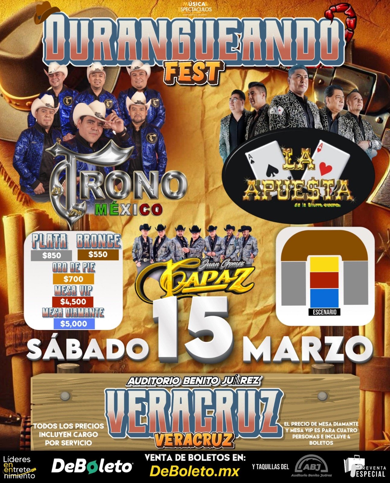 Acompañados de La Apuesta y Capaz de Juan Gómez, el género duranguense vuelve con todo al Puerto de Veracruz para deleitar a cientos de bailadores, los interesados en asistir al evento podrán obtener sus entradas en la plataforma de deboleto.mx.