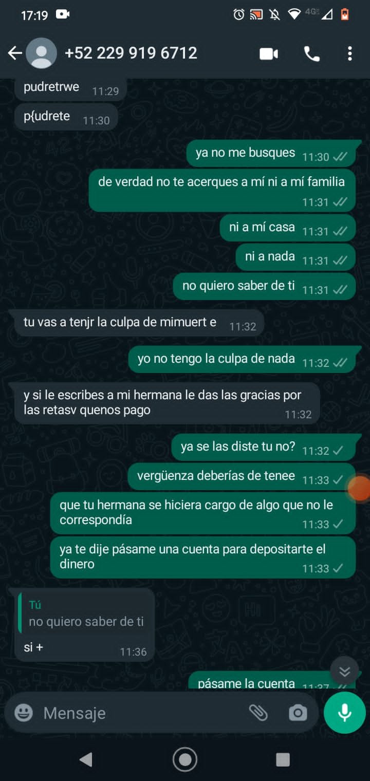 La madrugada del 23 de marzo su expareja la amenazó, «no sabes como vas a terminar, ni donde vas a acabar”, esto a las afueras de su vivienda en la colonia Estatuto Jurídico del municipio de Boca del Río.