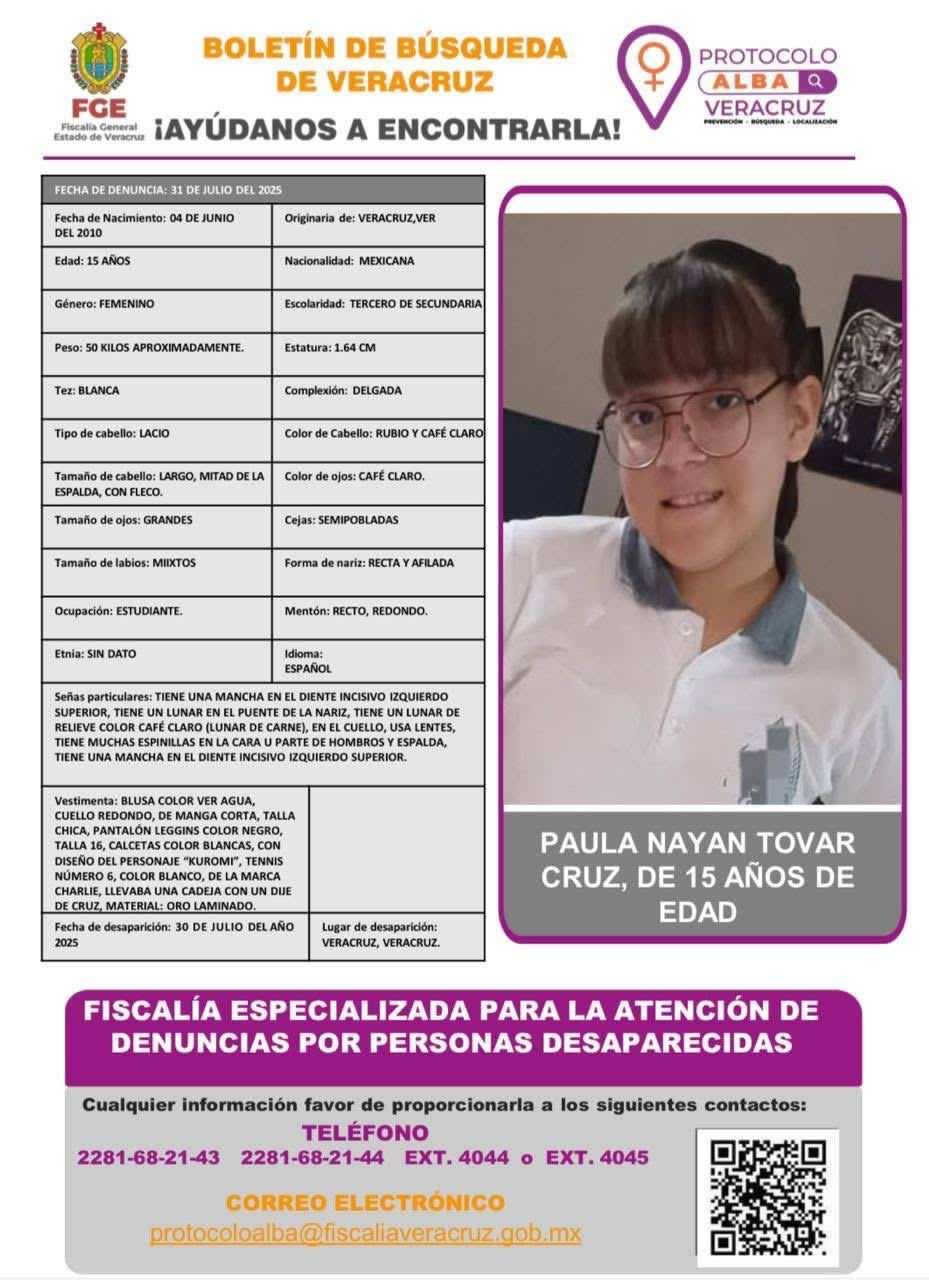 La adolescente identificada como Paula Nayan Tovar Cruz de 15 años de edad, fue reportada como desaparecida este jueves, por lo que la Fiscalía General del Estado emitió un boletín de búsqueda mediante el Protocolo Alba.