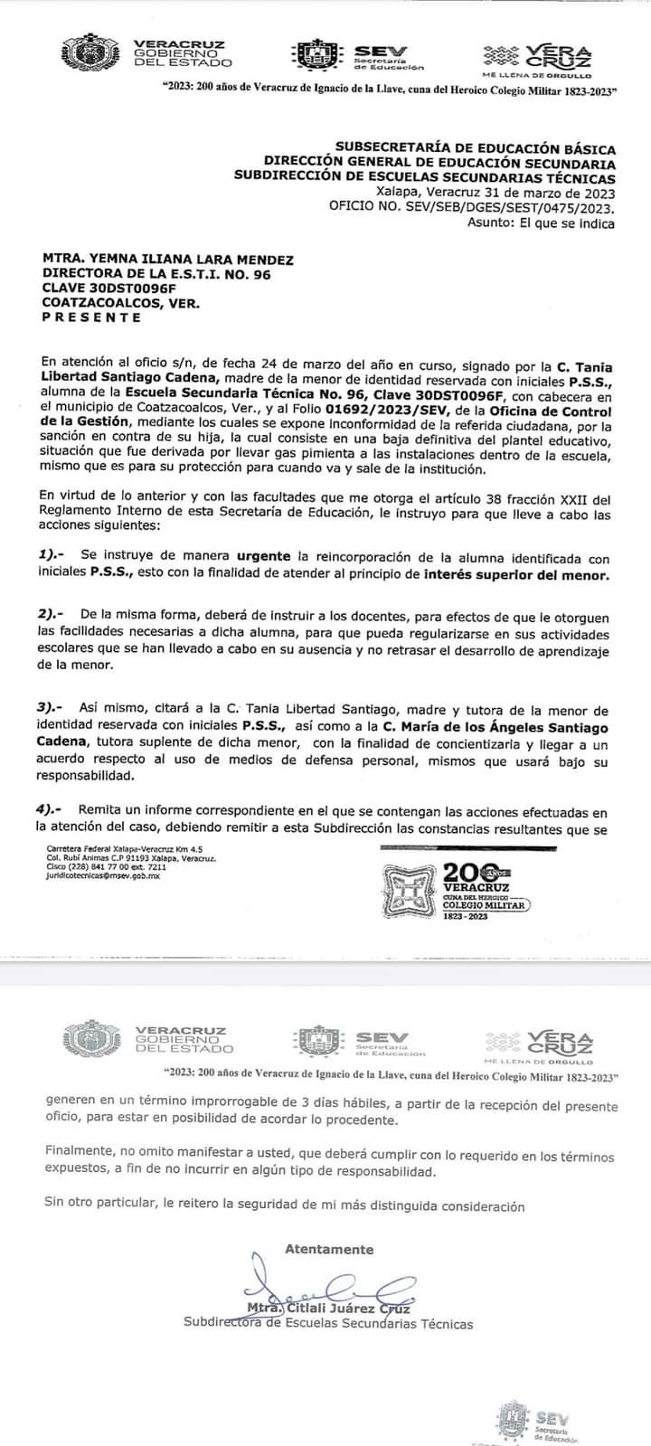 De acuerdo a un documento firmado por la subdirectora de Escuelas Secundarias Técnicas, Citlali Juárez Cruz, estableció que se deberá realizar una reunión con los tutores de la menor, así como con las autoridades del plantel para llegar a un acuerdo sobre los elementos de autodefensa.