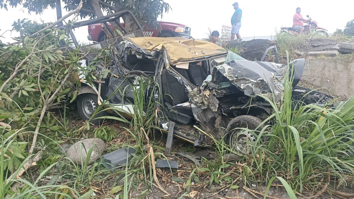 Los elementos de la policía iban a bordo de la camioneta Ford PA487, con placas de circulación 08-078, la cual se impactó contra dos árboles frutales, por lo que quedó completamente destruida.