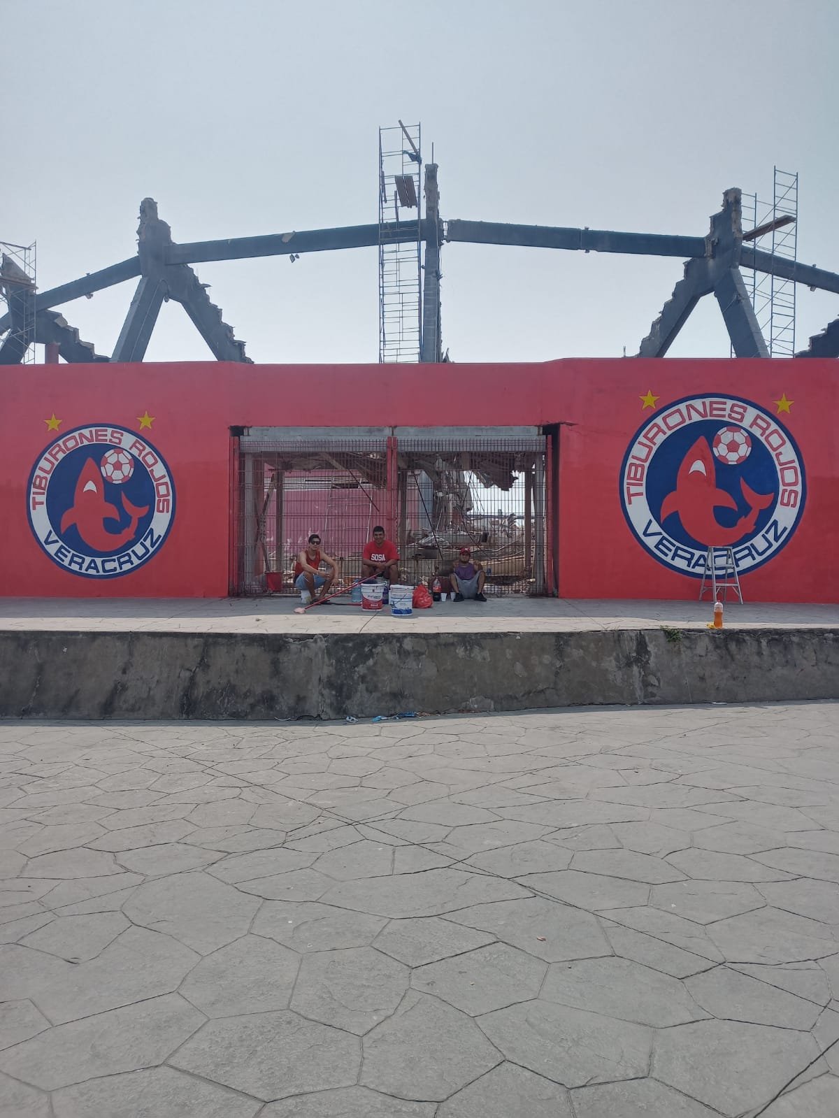 Boca del Río, Ver.- Integrantes del grupo de animación Imperio Rojizul «La Melodía de la Cancha» rehabilitaron el mural donde se encuentran los logotipos del club Tiburones Rojos, el cual se ubica a las afueras del estadio Luis «Pirata» de la Fuente, sobre la avenida Jacarandas.